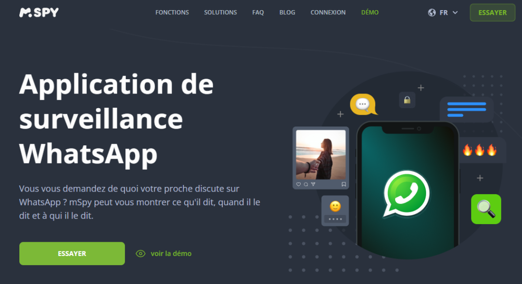La plateforme mSpy se spécialise dans la surveillance des activités en ligne de la cible. Cette application assure une localisation en temps réel, un journal des appels, une surveillance des messages texte et des applications de réseaux sociaux. Il considère notamment : Facebook, WhatsApp, Snapchat, etc.