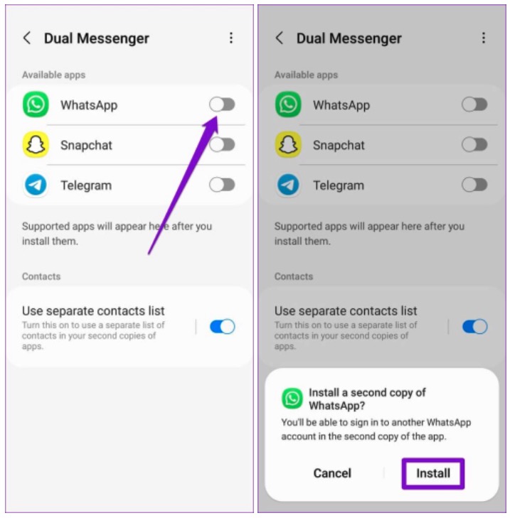 - Tendo feito isso, toque em “Dual Messenger” e ative a chave do WhatsApp ao lado do ícone.